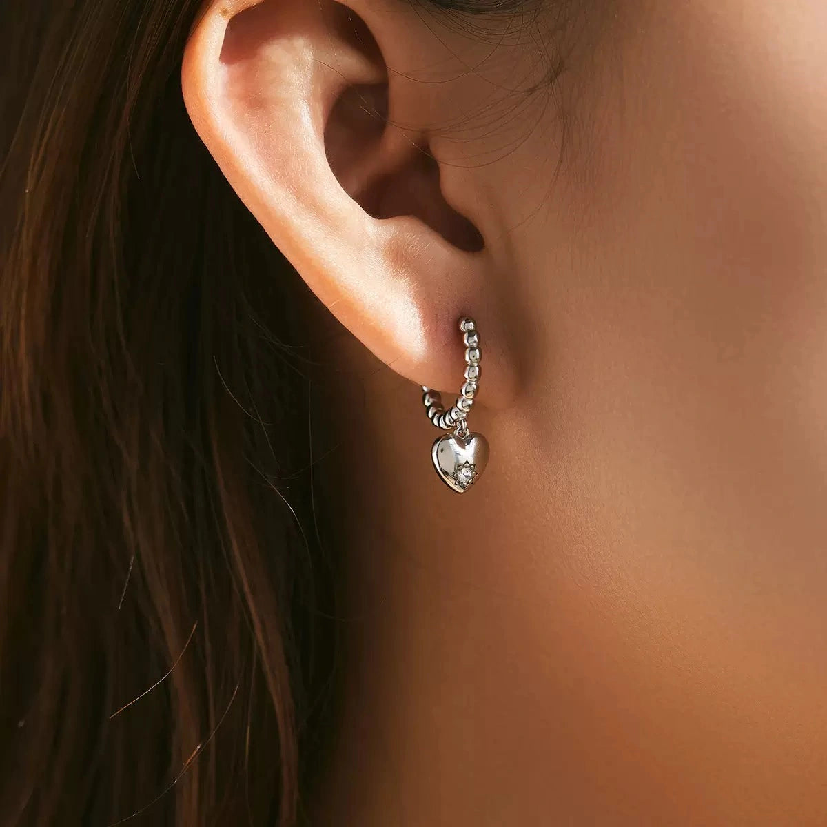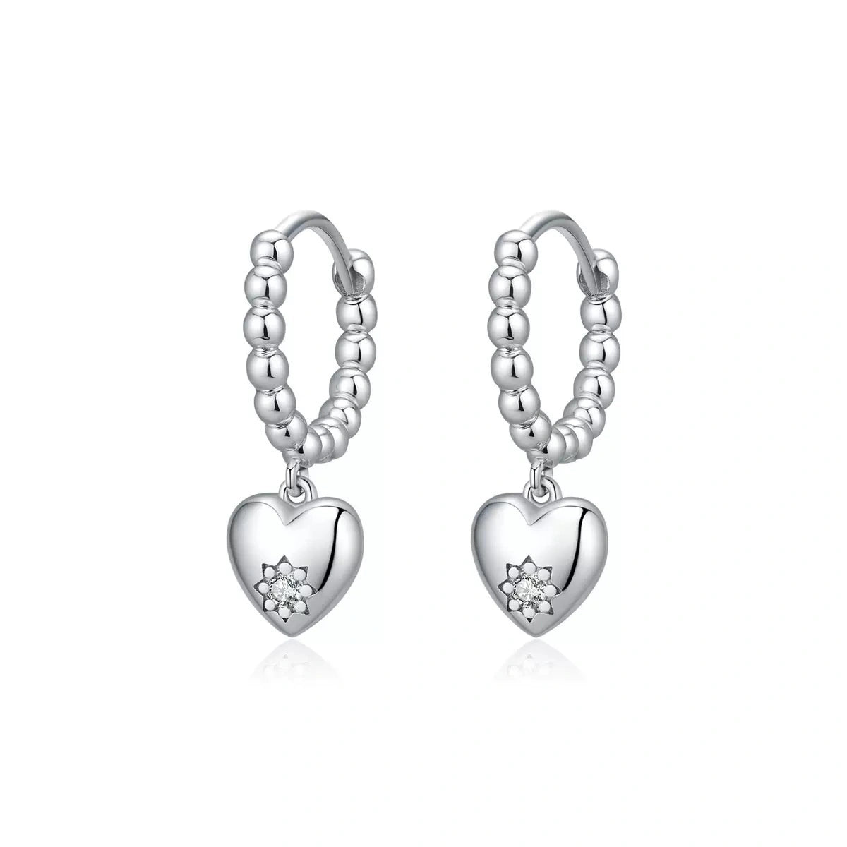 Like a secret whispered close, these earrings dance with every heartbeat. The hoops shimmer with a beaded silver rhythm, carrying heart-shaped charms that bloom with a delicate star of sparkling stones. They are not just adornments, but little talismans of tenderness—reminders that love is always in motion.