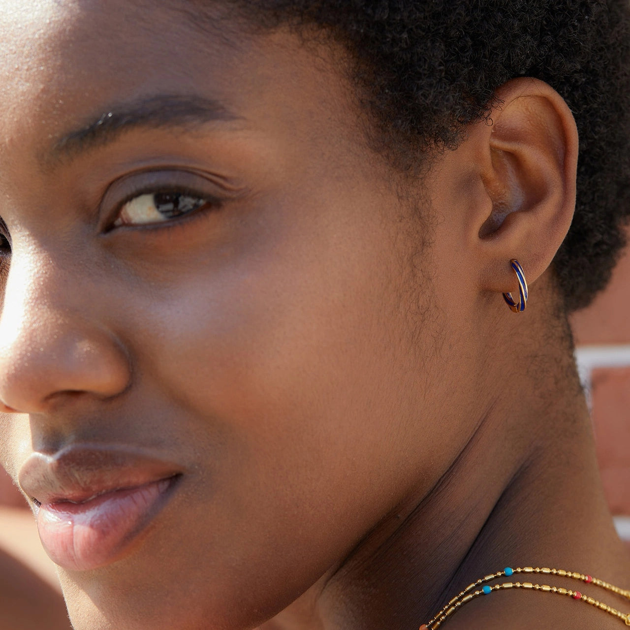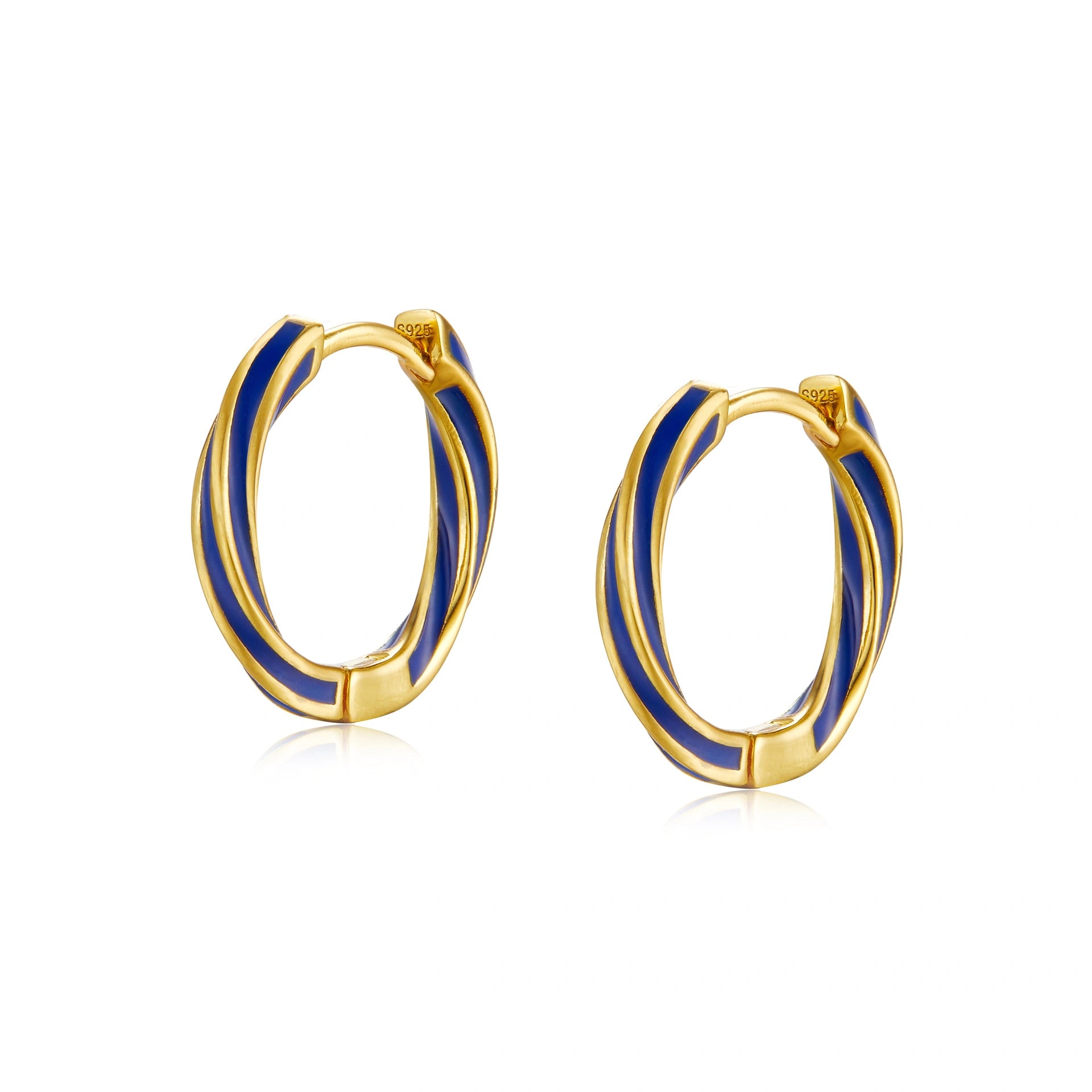 These captivating twist hoop earrings are a modern masterpiece. Crafted from sterling silver and luxuriously plated with 18K gold, they feature a unique, fluid twist design accented with a pop of vibrant blue enamel. The rich blue hue evokes the calm of a summer sky, adding a striking contrast and a touch of artistic flair to the classic golden setting.