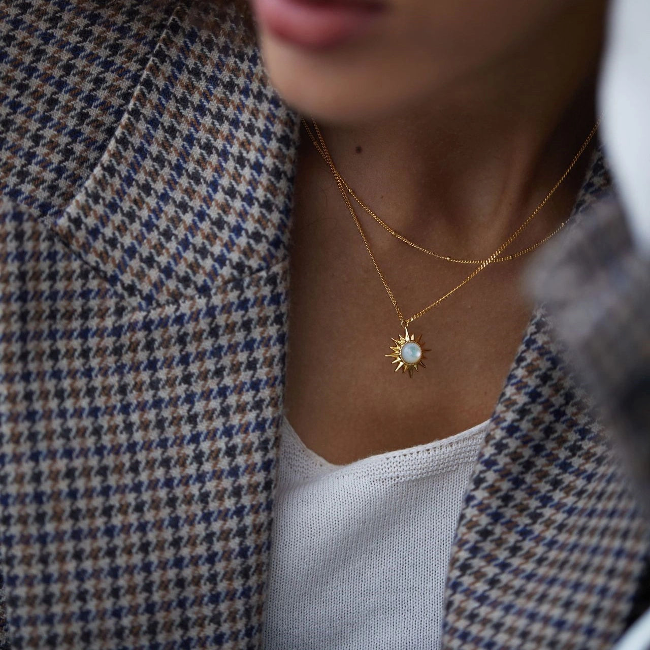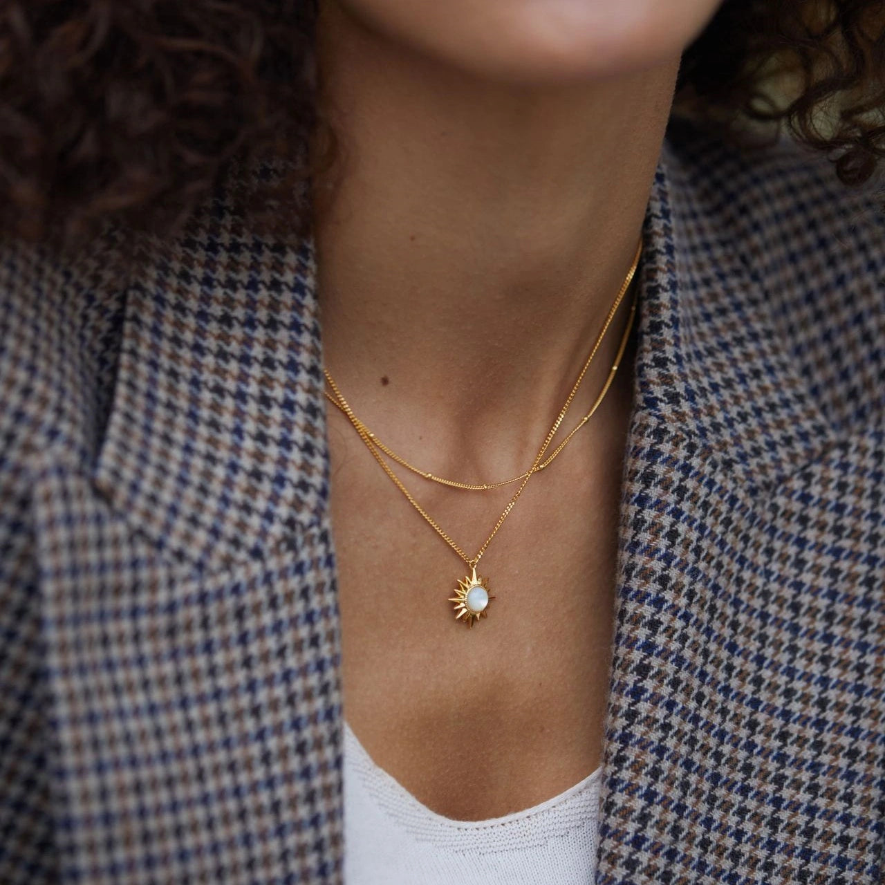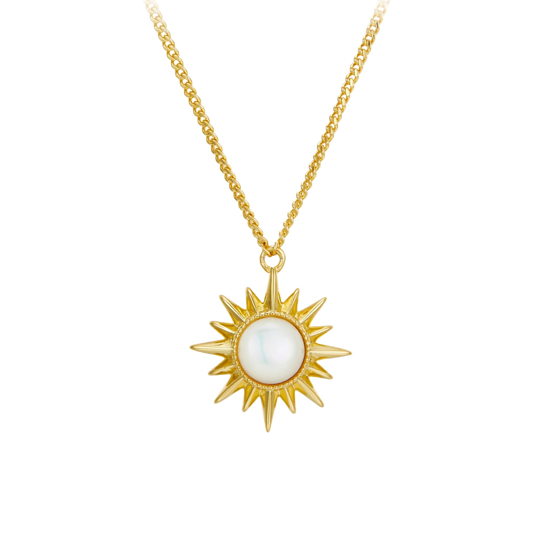 Inspired by the sun, this necklace features a centerpiece made of natural iridescent mother-of-pearl, surrounded by sharp, radiating rays—creating the look of a tiny, energetic sun. The soft glow of the mother-of-pearl blends perfectly with the bold lines of the sunburst, resulting in a piece that is both elegant and full of personality.