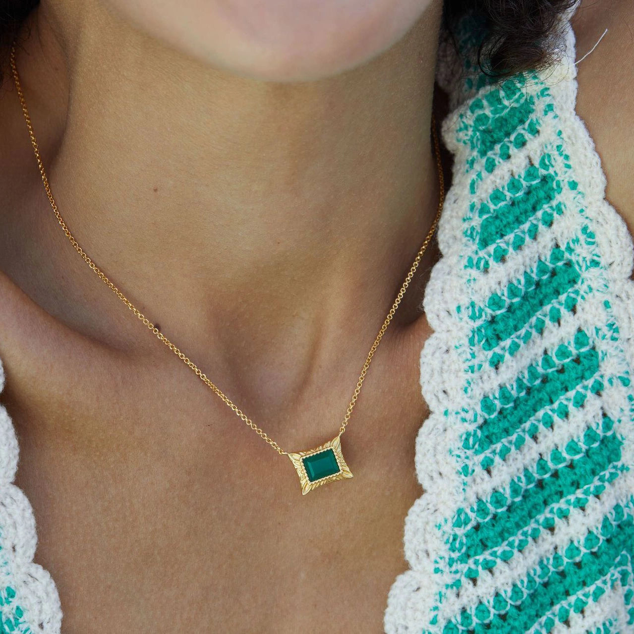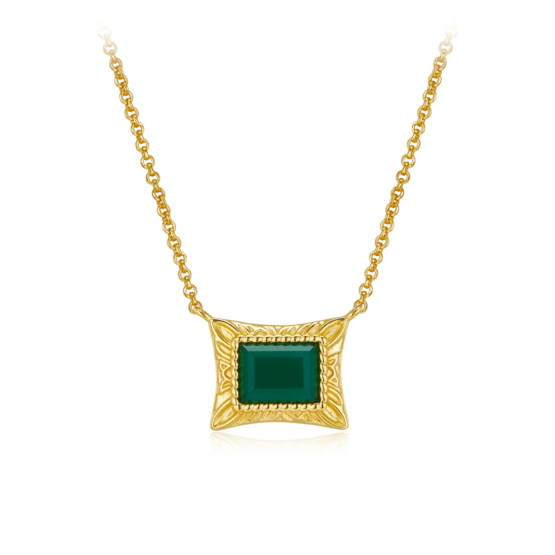 An elegant necklace featuring a vintage-inspired crest accented with gilded details and a deep green agate, reminiscent of a mystical gem from a secret garden. More than an accessory, it’s a whisper of your unique style—blending timeless elegance with the vitality of nature into everyday wear.