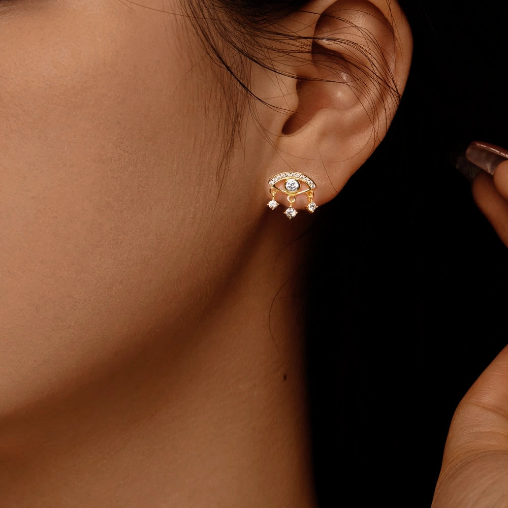 These intricately crafted "Guardian's Eye" earrings shine with a confident, golden glow. The symbolic protective eye—adorned with a halo of micropavé diamonds—represents wisdom and clarity, designed to reflect negativity and attract light.Below each eye, three delicate tassel pendants sparkle with movement, catching the light like falling stars and adding effortless elegance to your silhouette.