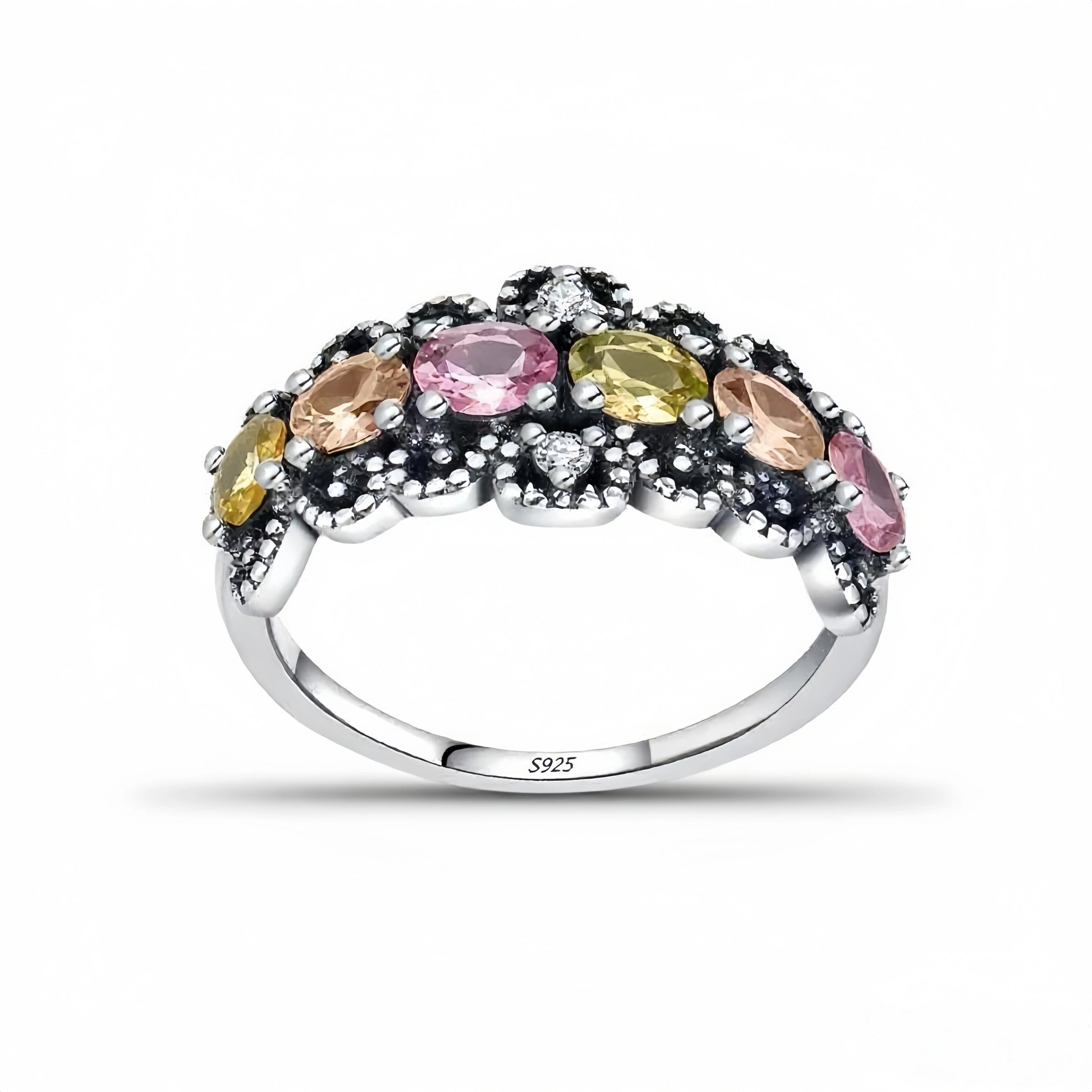 Don't be afraid to move forward—even dead wood blooms in spring, and the path you're on will one day burst into blossom, too. Some days may feel barren, but remember: life isn't about waiting for the storm to pass; it's about learning to dance in the rain and trusting that every step through dry spells leads to a season of bloom. Each vibrant zircon in this ring represents a challenge overcome or a precious memory made along your journey. And just as every flower must first grow through dirt, this ring is a tangible reminder that your path, no matter how difficult, is leading you to flourish.