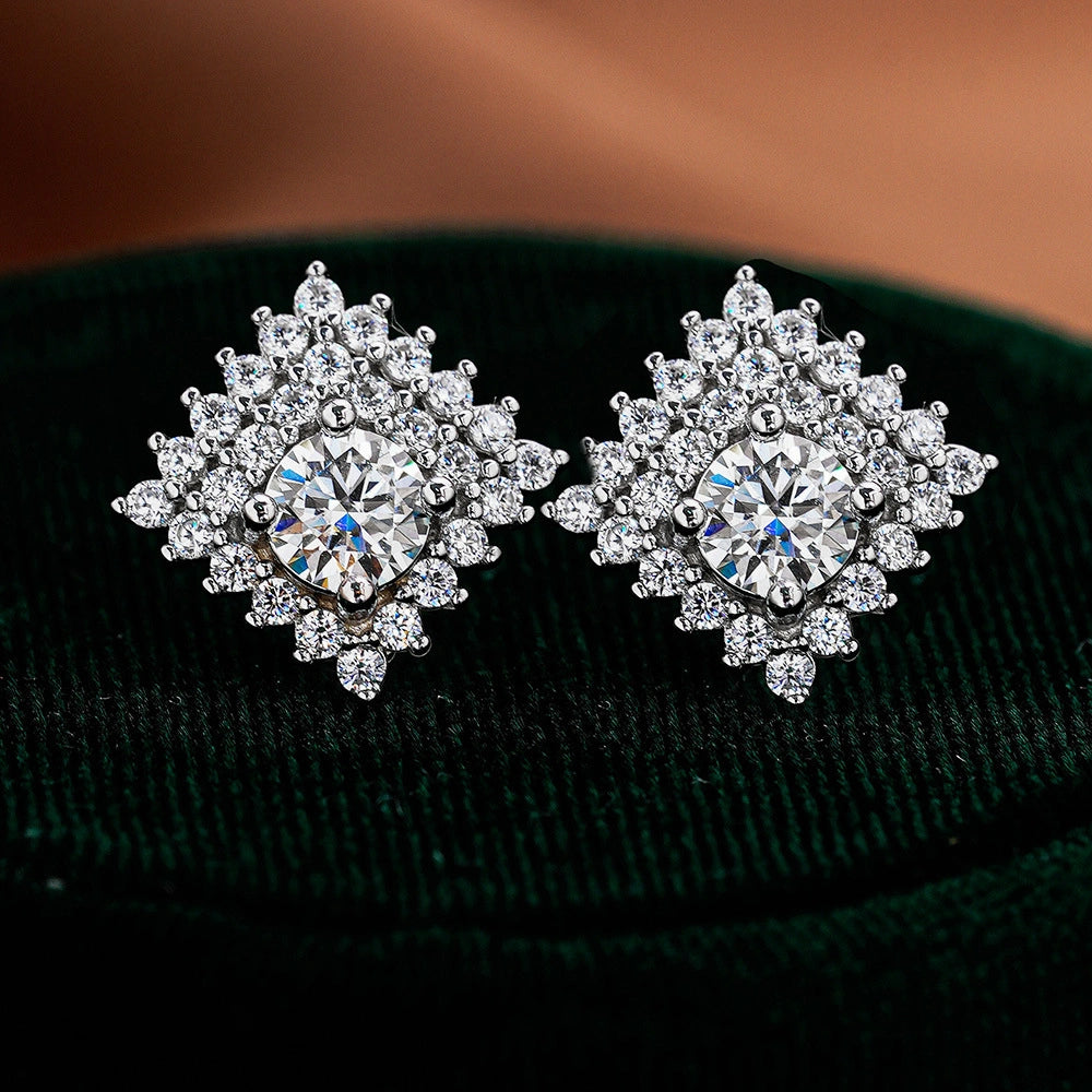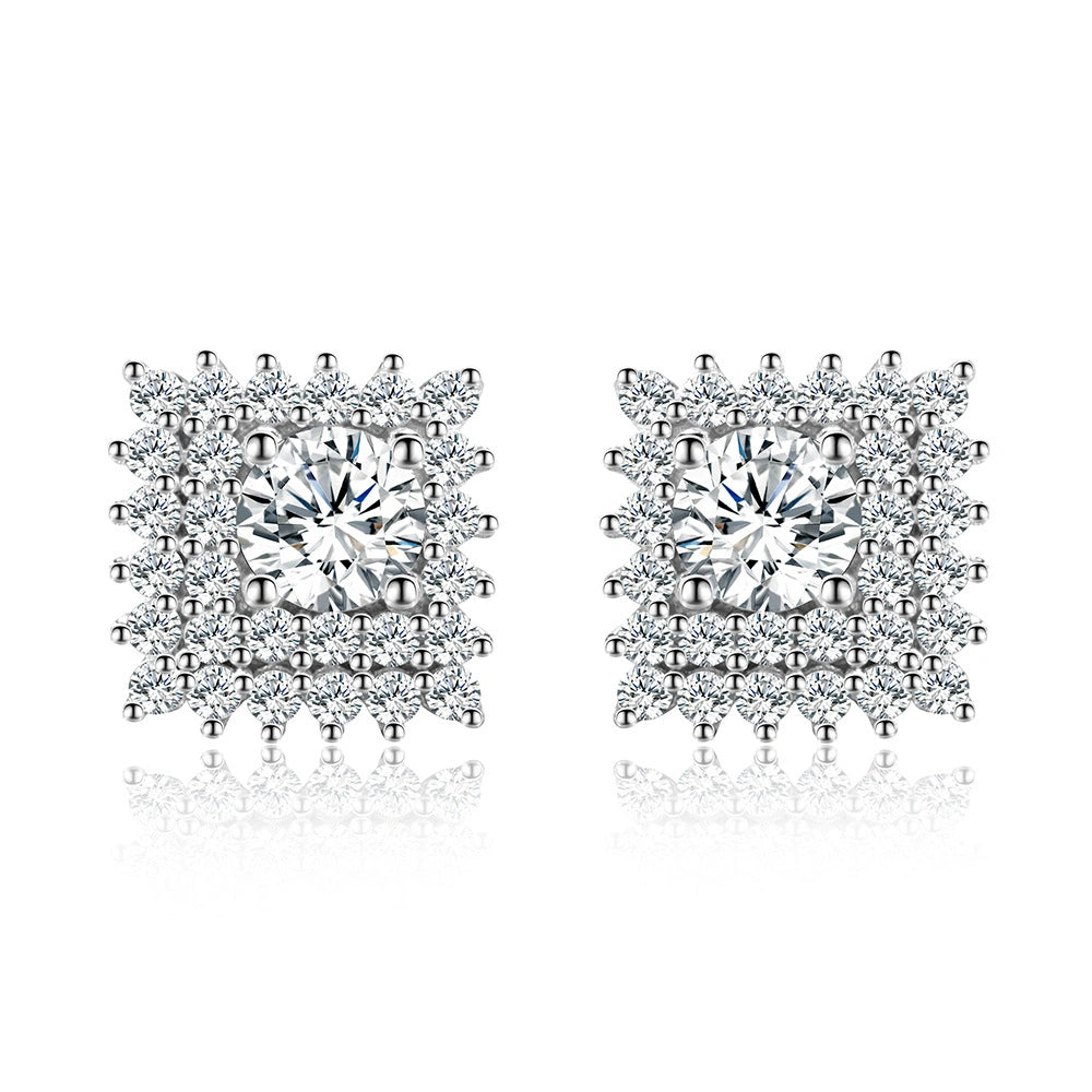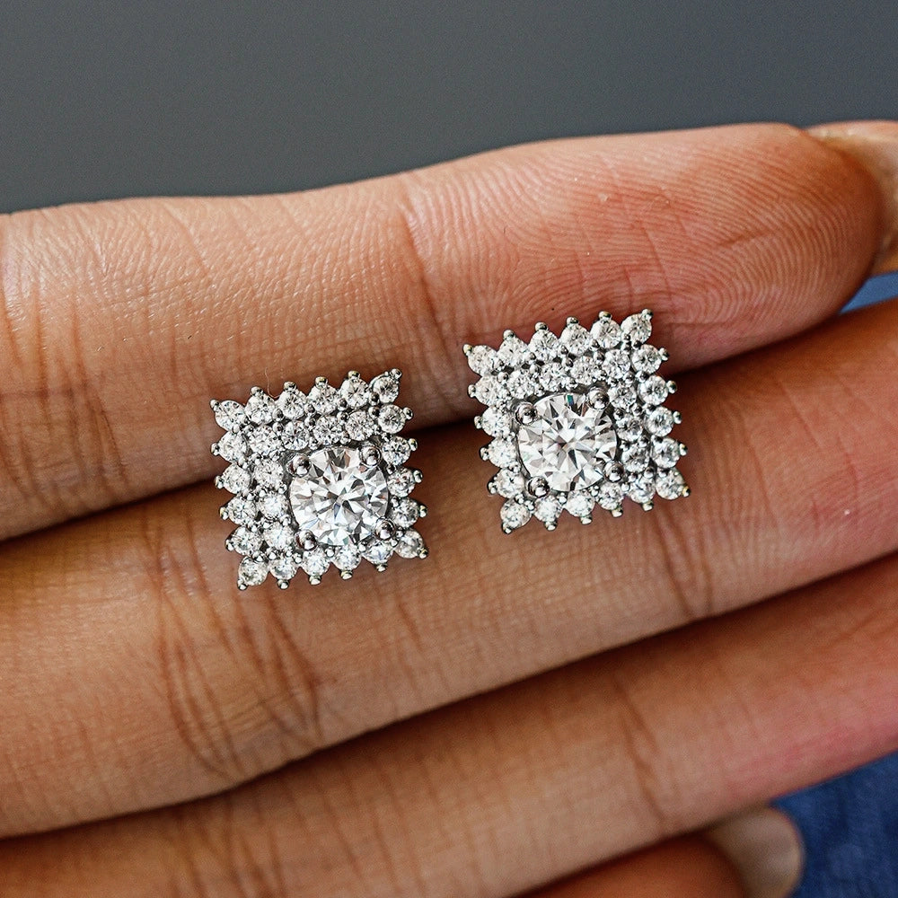 Make a brilliant statement with these captivating square halo stud earrings. A stunning, brilliant-cut cubic zirconia sits at the center, radiating with pure light, and is beautifully framed by a halo of smaller stones that create a striking, star-like silhouette. This unique design brings a touch of celestial glamour to your look.