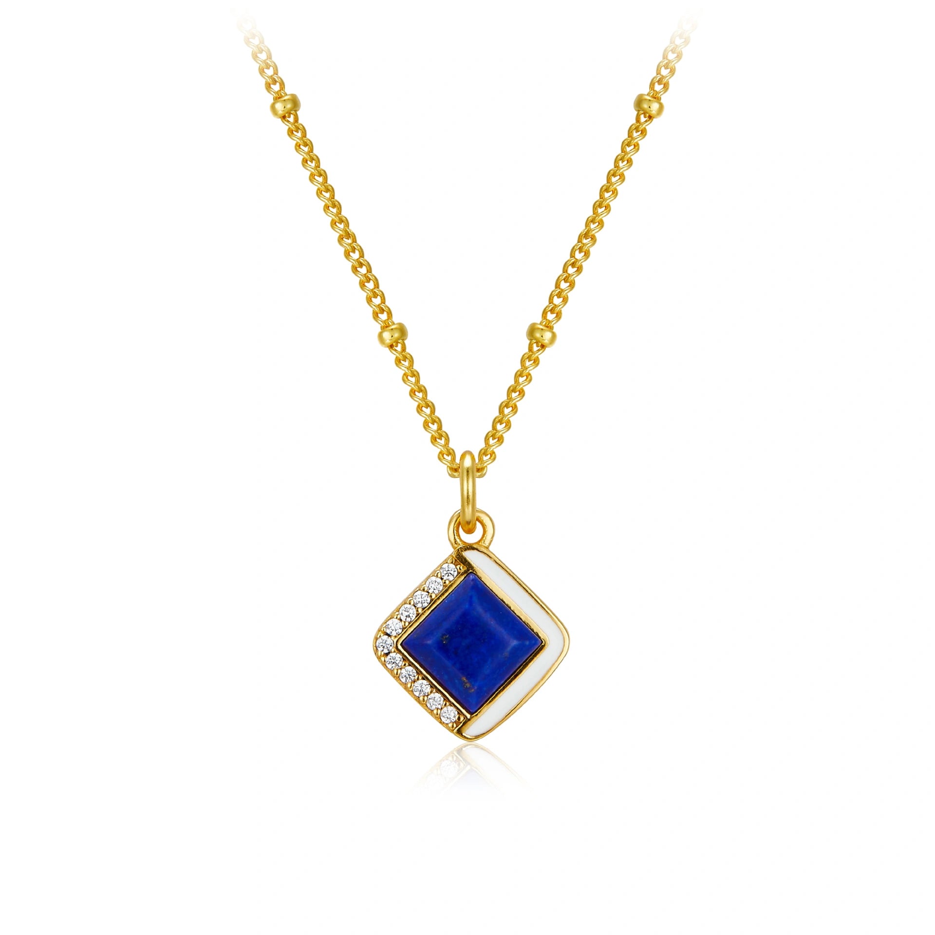 Framed in a gilded diamond shape, this pendant centers a deep lapis lazuli resembling a starry night sky, delicately accented with scattered diamonds that twinkle like stardust.