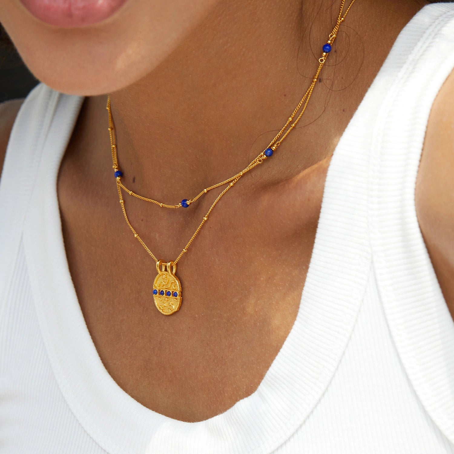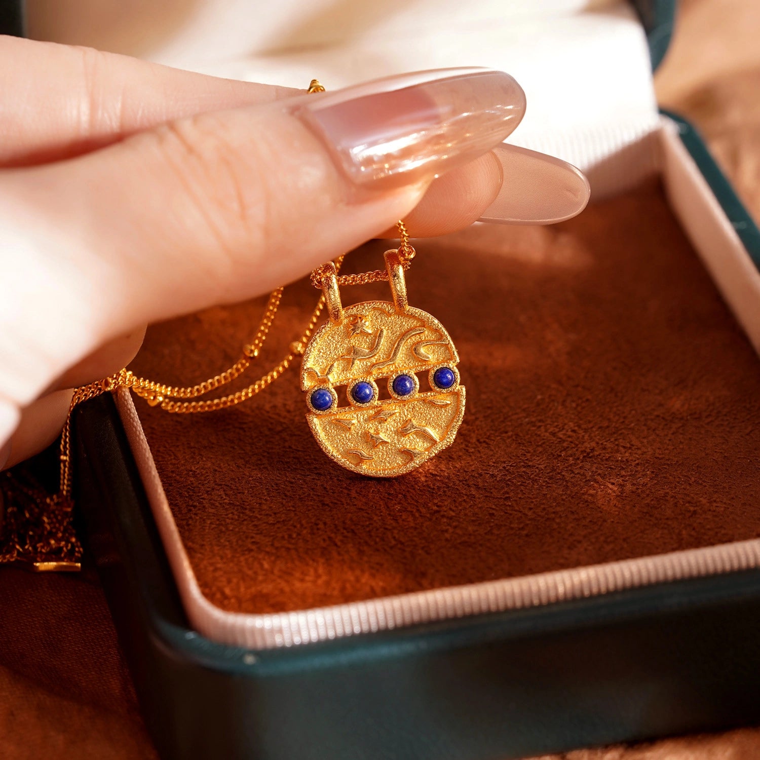 This vintage-inspired pendant features meticulously engraved symbols—each mark a testament to time, evoking a mysterious and artistic allure. At its heart, four deep blue sapphires form a captivating “Azure Galaxy,” shimmering like a river of hope flowing through a golden landscape.